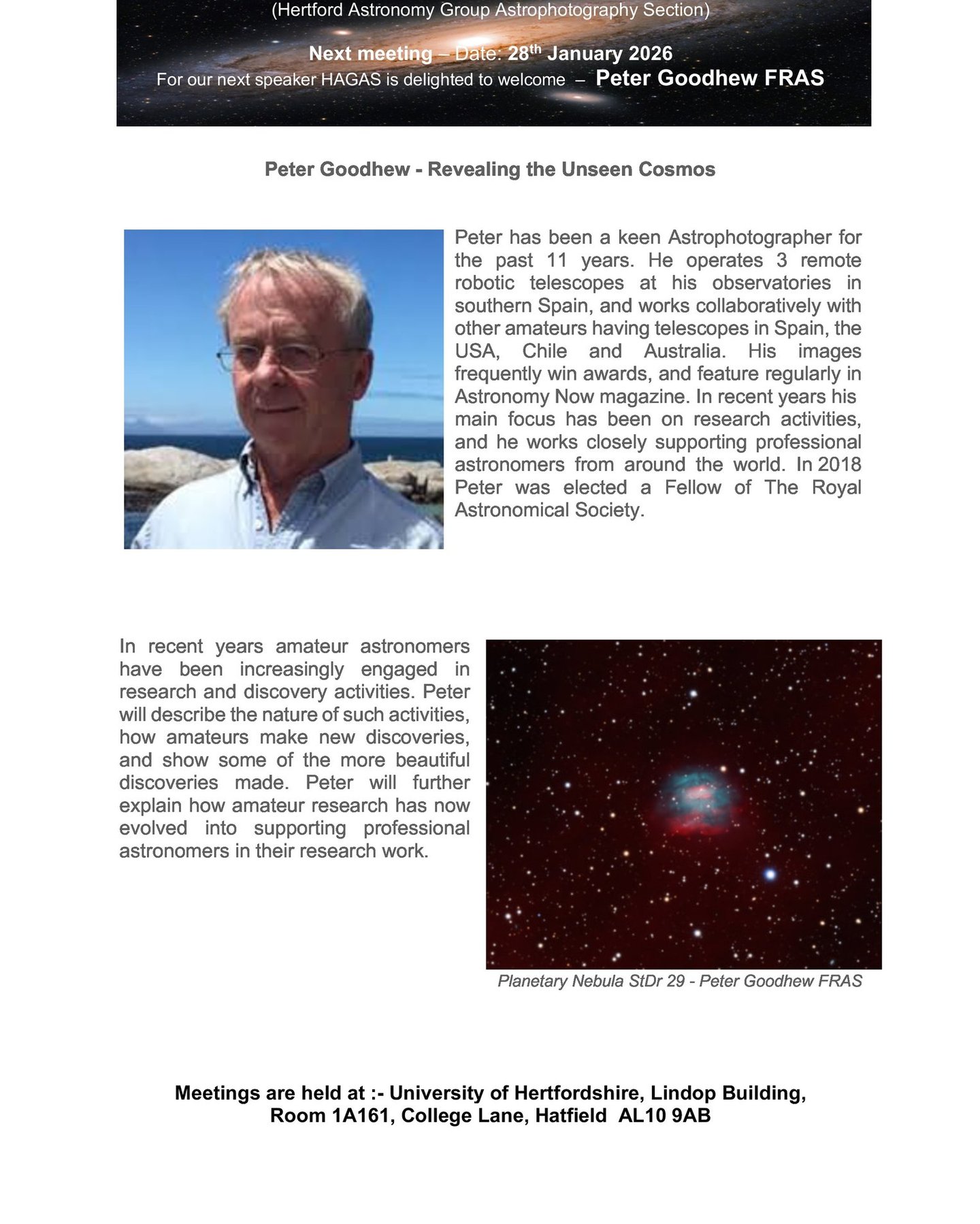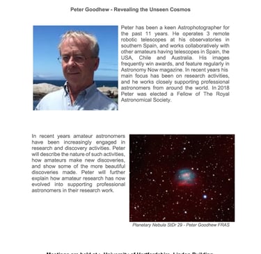 25 February - John Hayes - US based Astrophotographer (Zoom)- Topic TBA
