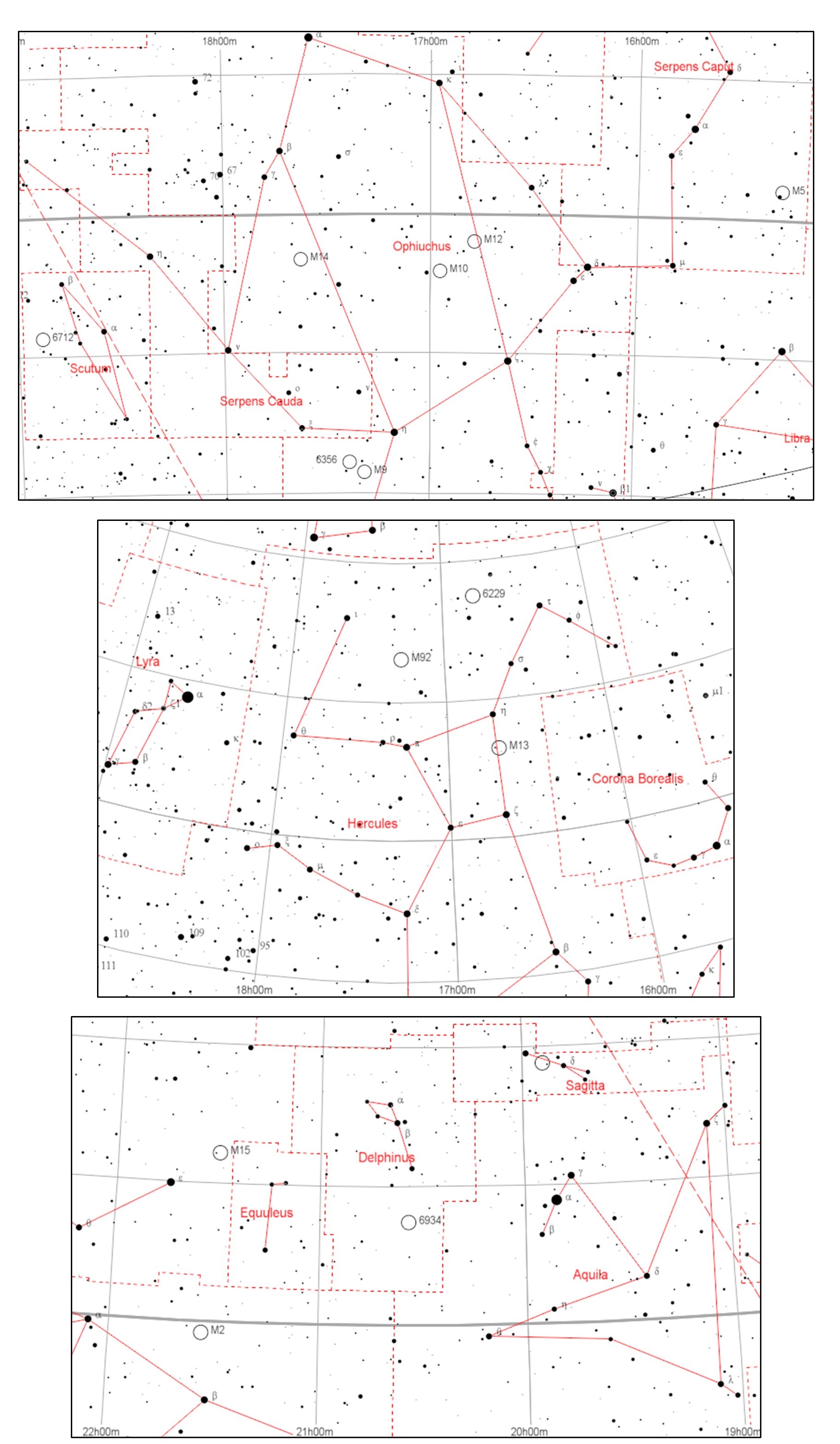 Sean Ryan’s Grand Tour of Globular ClustersIn late summer in the northern hemisphere, it’s easy to know where you are in the Galaxy. At dusk, the Milky Way extends almost vertically from the southern horizon to the zenith (and further east, of course), and low on that south-western horizon is the constellation of Sagittarius. Looking towards Sagittarius, we are facing the Galactic Centre, some 26000 lightyears away. From a dark site, the Milky Way is notably more expansive around Sagittarius than in other directions because of the greater number of stars and more interstellar matter towards the central regions of the Galaxy…..